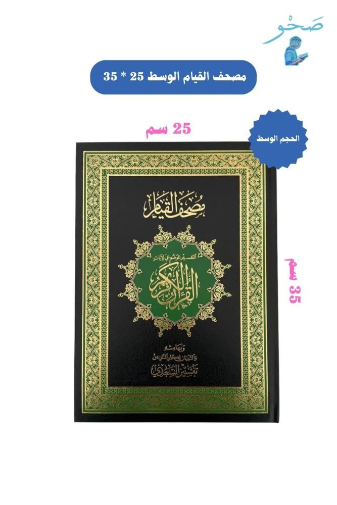 3- وهو مصحف شريف برواية حفص عن عاصم وبجميع القياسات والأحجام والألوان التي يمكن أن تطبع بها المصاحف الشريفة وقد تم إنجاز هذا المصحف الشريف بحيث تم ضغط خمس صفحات من المصحف العادي إلى صفحة واحدة من مصحف القيام مع ضبط السور والآيات وتدوين رقم الصفحة مع الصفحة المقابلة من المصحف الشريف العادي ويتم تطبيق ذلك من خلال آلات طباعة متميزة وحديثة مع المحافظة على الضبط والتشكيل.